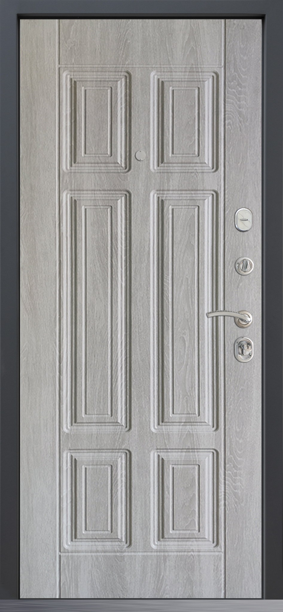 •  ОТДЕЛКА СНАРУЖИ: Лист стали, окрашен порошково полимерной краской, цвет "Шагрень графит", декоративная МДФ-панель 10 мм, цвет - "Верона графит"
